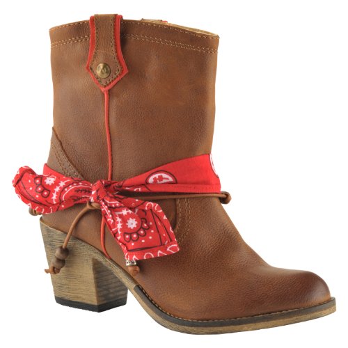 Commit to a trendier day-to-day look with these of-the-moment western boots featuring pull-on leather shaft with side tabs, knotted paisley scarf, and faux-wood heel.